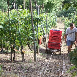 Le Vigne used for Dogliani Superiore Sori San Martino, the Langhe In Sorì and for most of the Barbera Langhe are very steep so the baskets once filled are moved to the top of the vineyard using a winch and a sled.