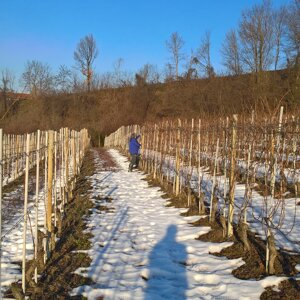During the period from December to mid-February the vines are pruned. The system that we use is called Guyot Simple, that is the most worldwide used method of pruning for a type of viticulture dedicated to quality. We leave a small outcrop (which will give the shoots for the following year) and a fruiting. The branches of the past season, called "sermenti", are thrown to the ground and comminuted in a way that will form the organic substance. After the step of pruning the new fruiting must be linked to the support. This work begins controlling stakes and replacing those worn out. It is therefore necessary to cut the wicker from the willows, used for the ligation, and start the "legatura", which usually lasts from mid-February until the end of March.